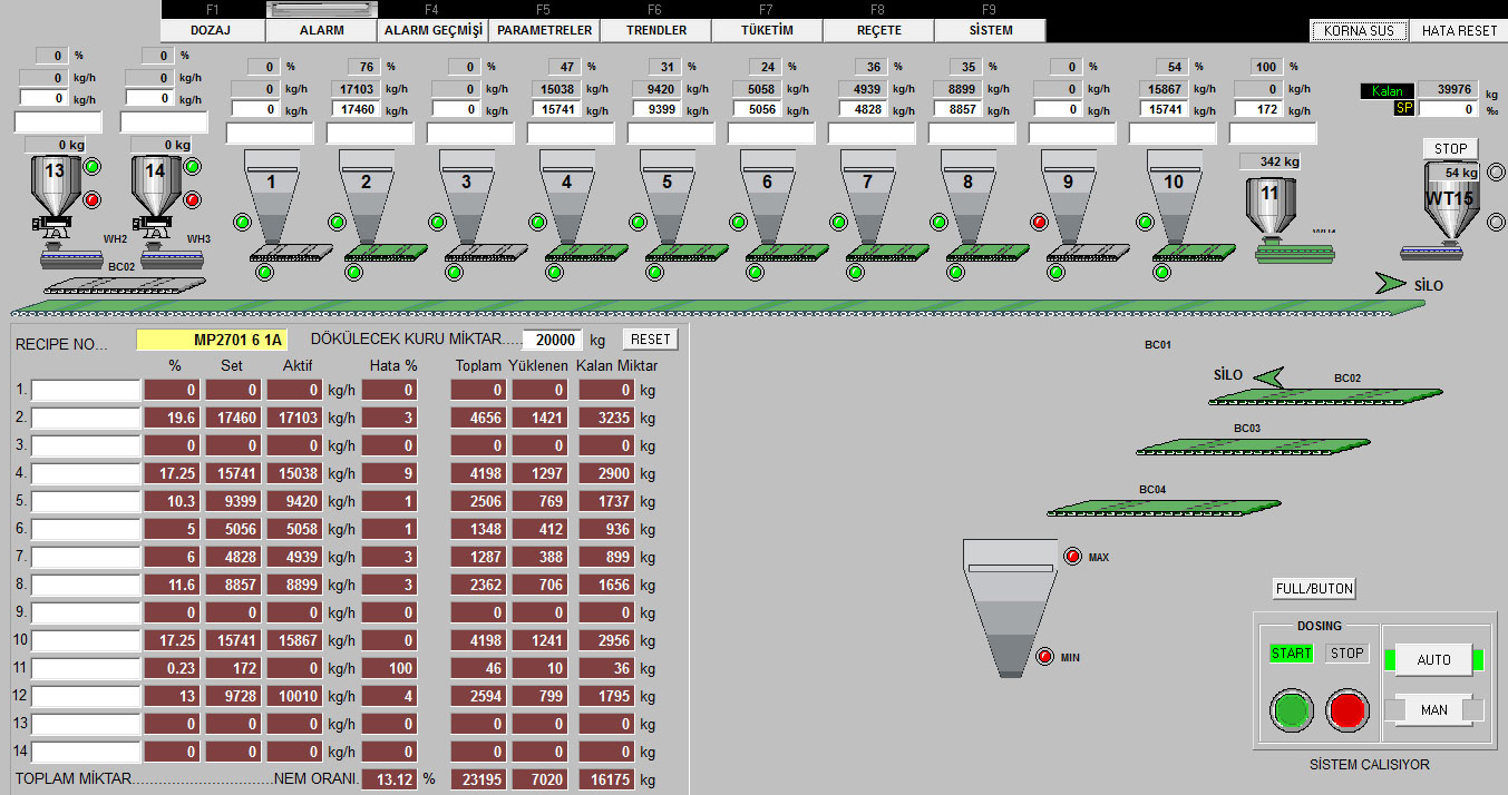 • 7 Tartım bantlı, 4 kırıcılı paletli götürücü,1 helezonlu bunker sistemi ile reçeteye uygun hammadde hazırlama gerçekleştirildi.